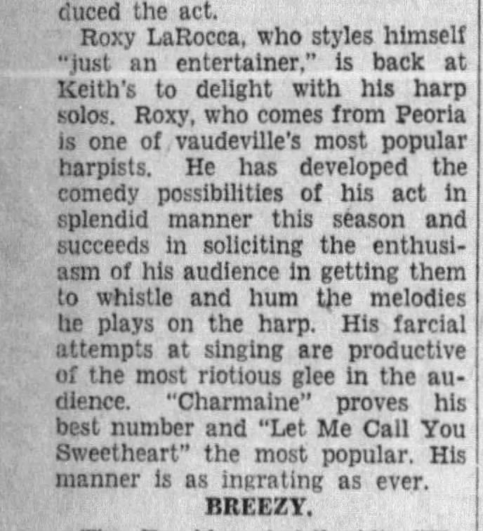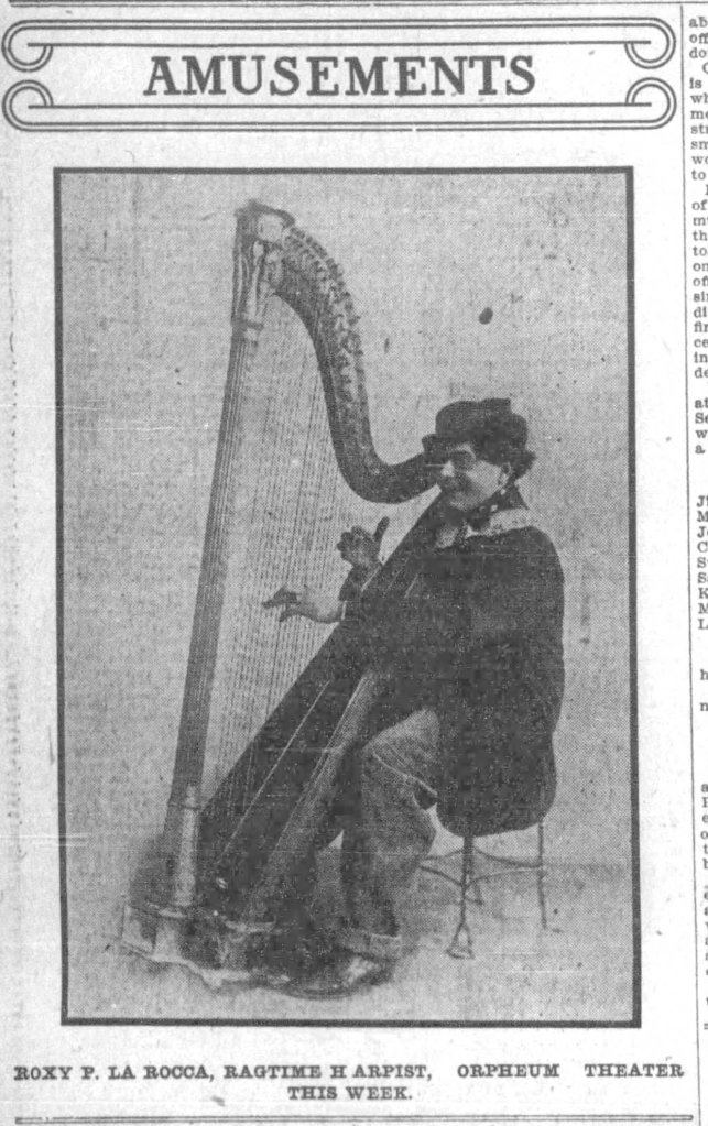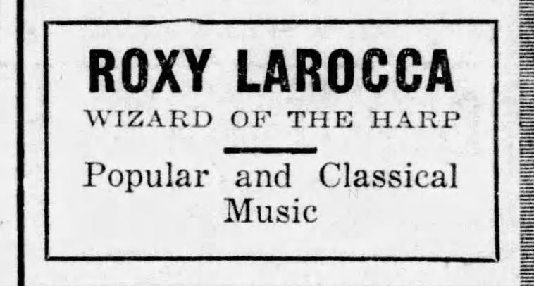 Roxy was a famous-at-the-time Vaudeville harpist, known affectionately as the Wizard of the Harp.