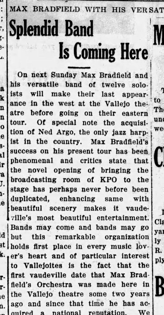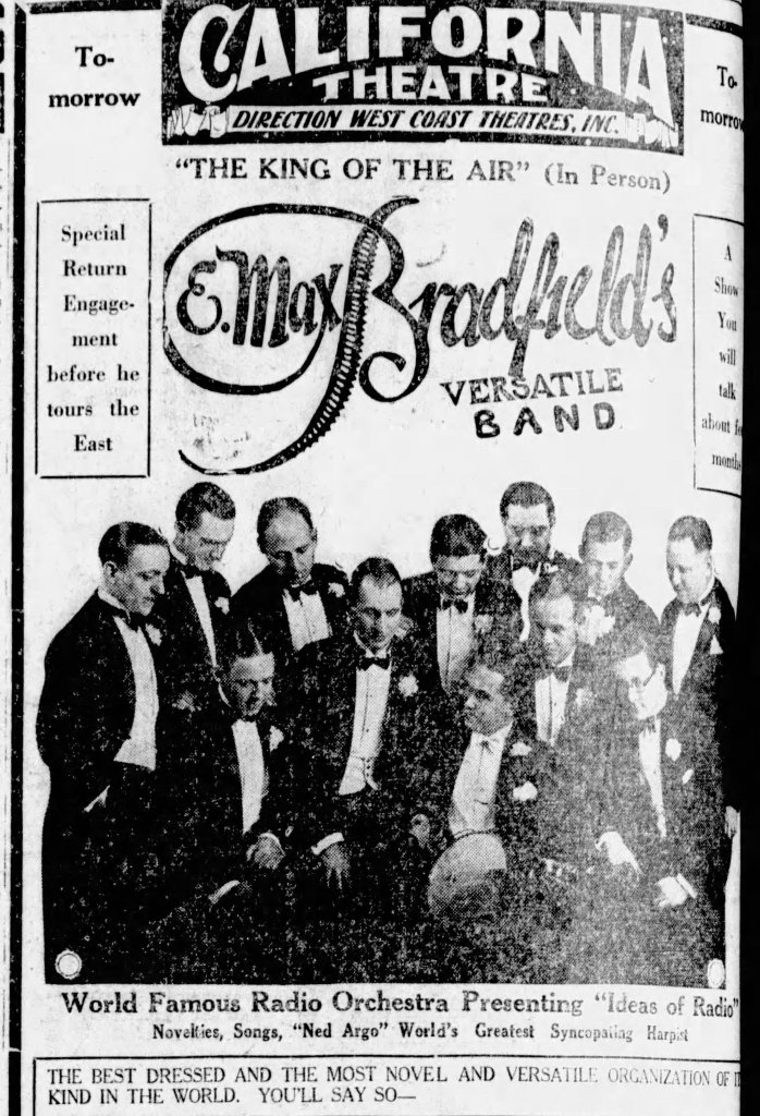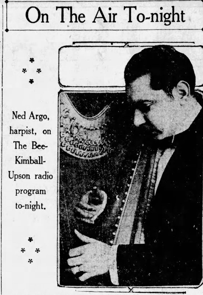 Ned was to have a future in performing with his harp for radio broadcasts in Los Angeles. More on this later.