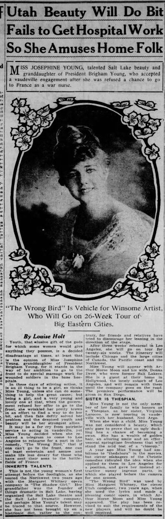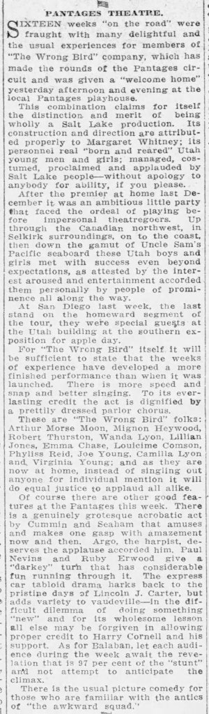 The musical play The Wrong Bird was written by Margaret Whitney, part of the theater and music circles in SLC. Whitney was noted as a successful “girl composer,” by several news articles at the time. The homestate Utah newspapers offered generous coverage to Whitney’s career and The Wrong Bird. Pantages picked up the musical play and the SLC based troupe toured on the circuit of Pantages owned theatres