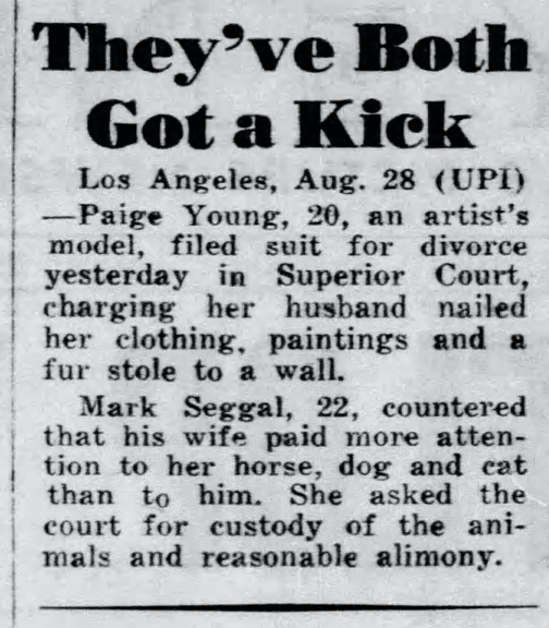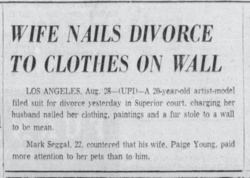The filing states that Mark threatened Paige and her animals with bodily harm “on numerous occasions,” and on August 17, 1964, “brandished a knife in her presence,” and “Plaintiff’s profession is that of an artist and painter and on or about June 15, 1964, defendant maliciously and with intent to destroy plaintiff’s artwork drove nails through plaintiff’s prized paintings and further did mischievous damage by driving nails through plaintiff’s personal belongings including an expensive fur stole.”