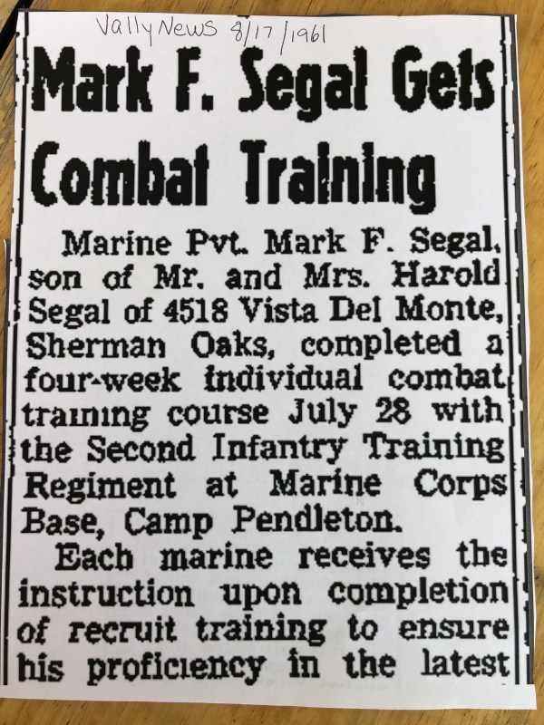 Paige’s new husband was born in 1942, the son of WW2 veteran Harold Segal and his wife. Mark was a marine private who took combat training in 1961 at Camp Pendleton.
