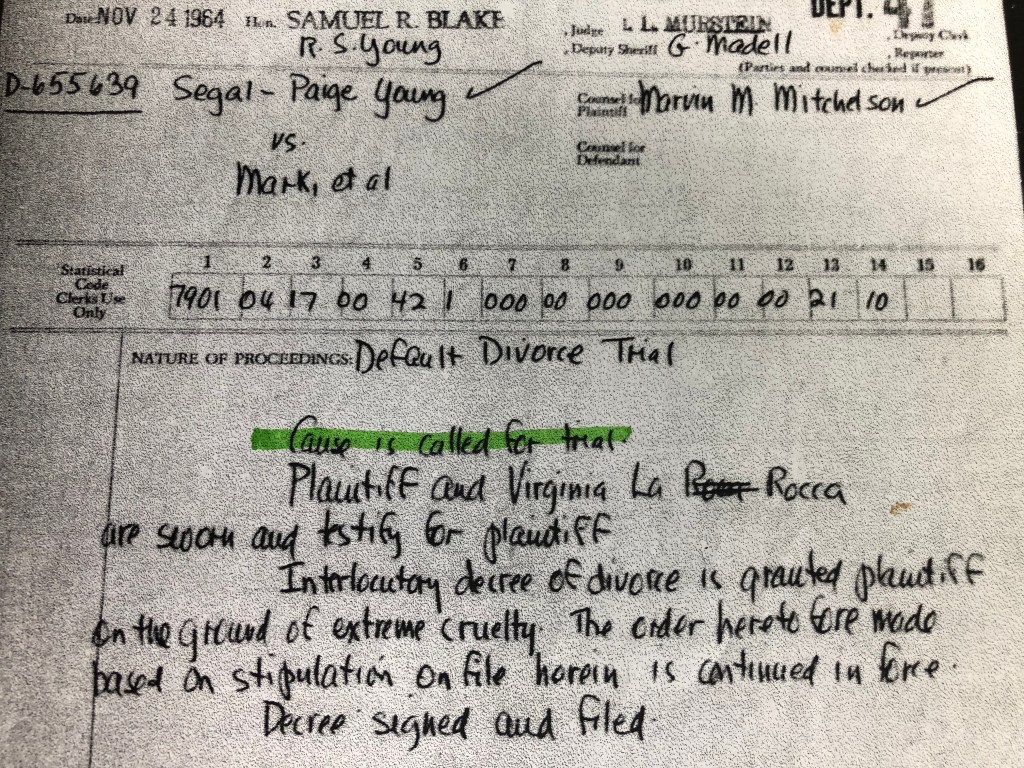 Virginia LaRocca testifies for the plaintiff, her granddaughter Paige. An interlocutory decree of divorce is granted to Paige on grounds of extreme cruelty. But it was never finalized according to the clerk who helped me in DTLA, in a building across the street from Hill St, in a basement where they keep old hard copy records.