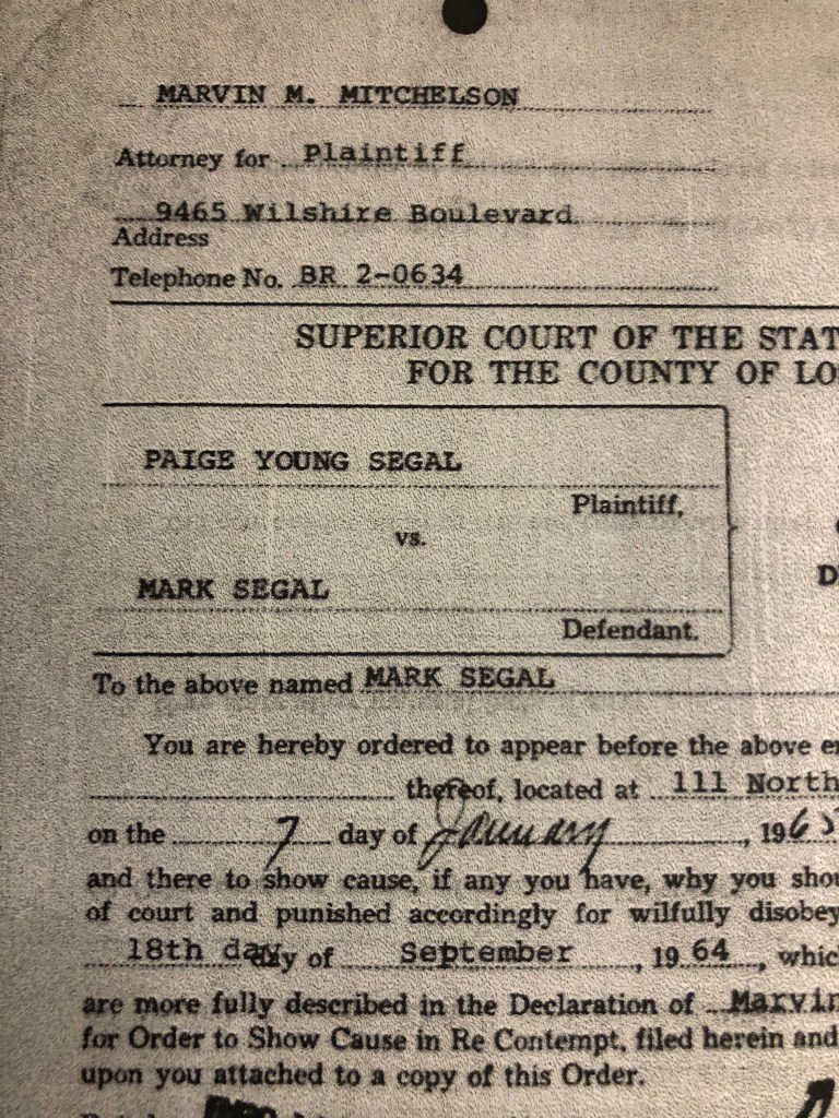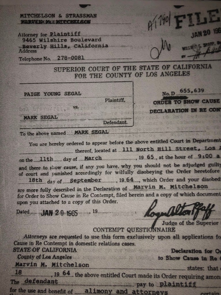 Paige sues Mark Segal for divorce after less than one year of marriage. She is represented by rising celebrity attorney Marvin M. Mitchelson.