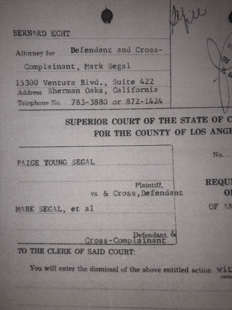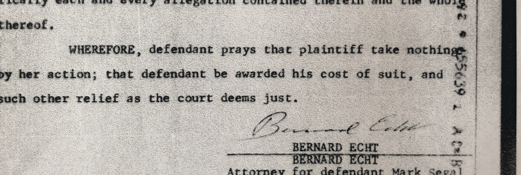 Mark’s attorney is Bernard Echt from Sherman Oaks. Echt, a few years down the road, would represent the milkman who was being sued by Vincent Bugliosi for suspected impregnation of his wife. Strange yet true.