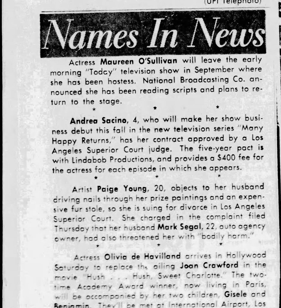 The divorce filing was picked up by the wire service UPI and appeared in several newspapers across the country.