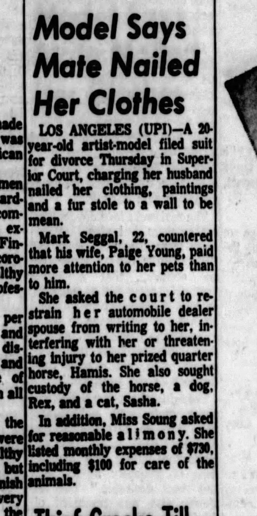 1963 October 1st Paige Young marries Mark Frederick Segal in Las Vegas, per impossible to read ledger records easily found on ancestry.com.