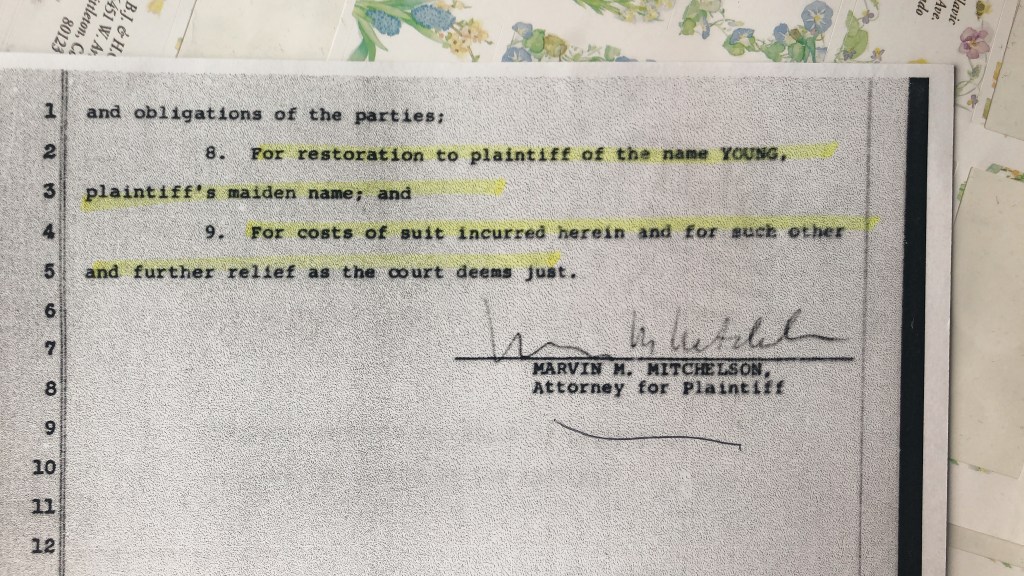 Marvin Mitchelson, on behalf of client Paige, asks for alimony, lawyer’s fees and court costs: “Plaintiff is not employed and presently embarking on a career as a painter, therefore needs the money from Defendant who is able bodied and employed.”
