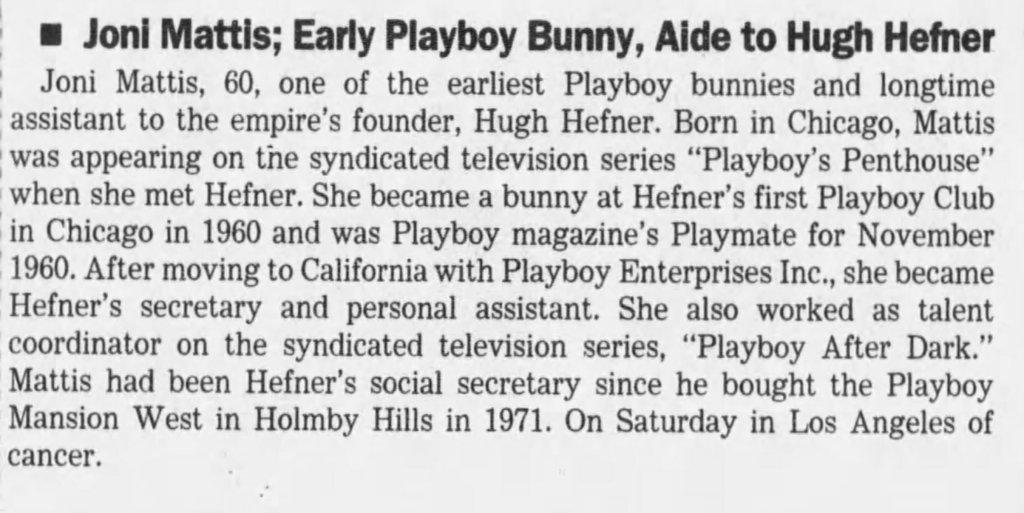 Joni Mattis was a Playmate in November of 1960. Also girlfriend around that time, of Hugh Hefner. She was an employee of Playboy nearly her entire life.