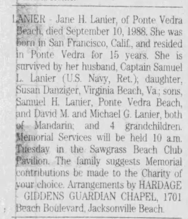 The family lived in San Diego, Hawaii. Around the late 60s, they settled in Jacksonville, florida for a long time. Then, Ponte Verde, Florida where Jane died in 1988 at the age of 64.