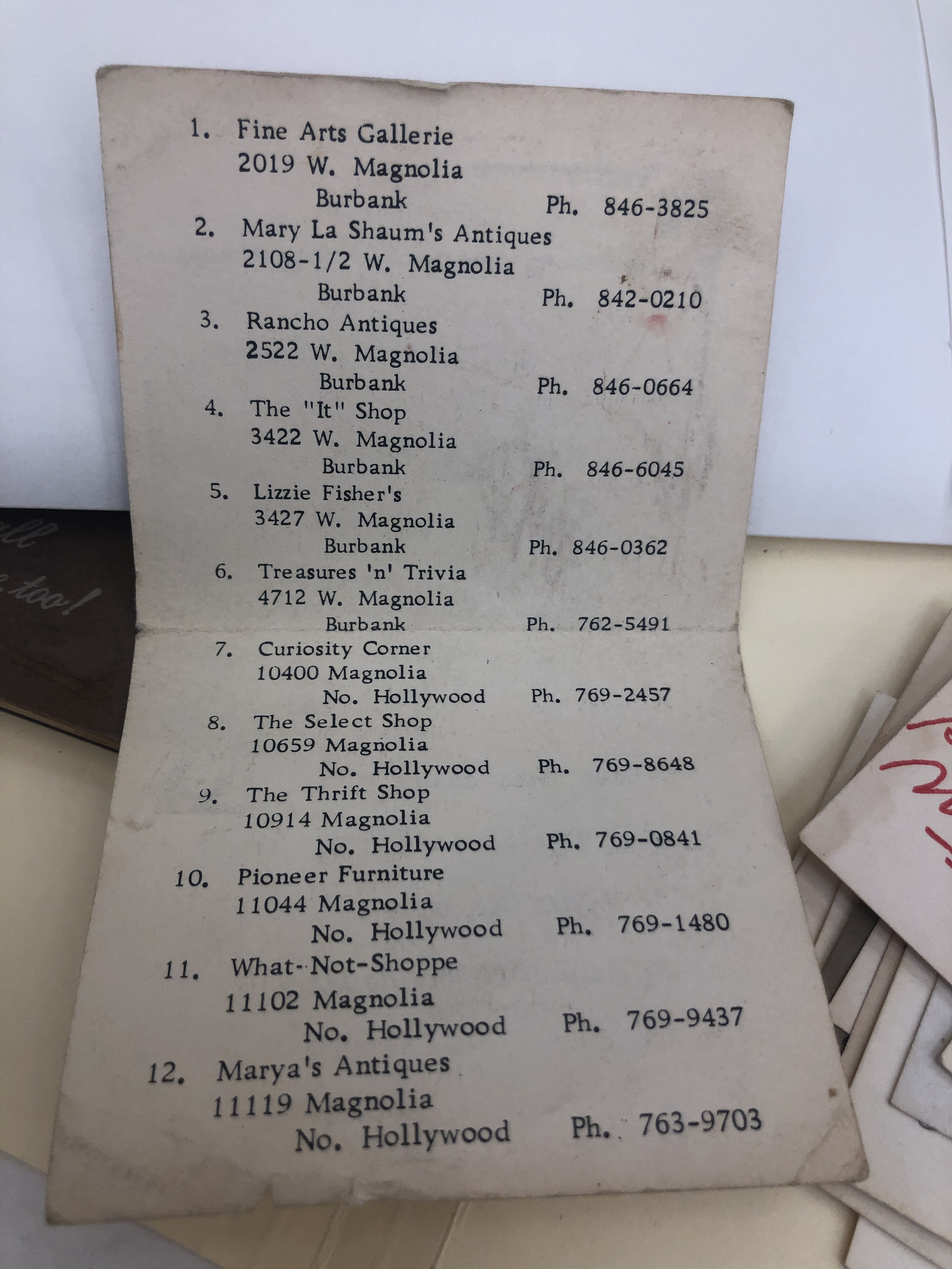 The 3 images below are a store guide of antique and thrift stores on Magnolia Blvd. in Burbank. Samson was known for collecting antiques, art, and all kinds of home decor, which he displayed in his home on Barton Way.