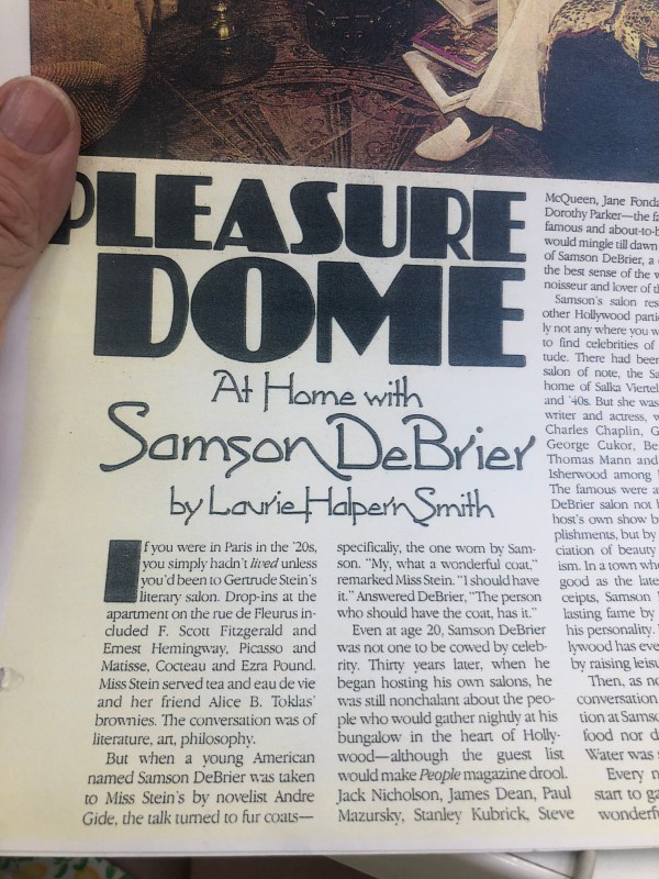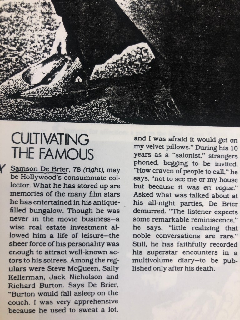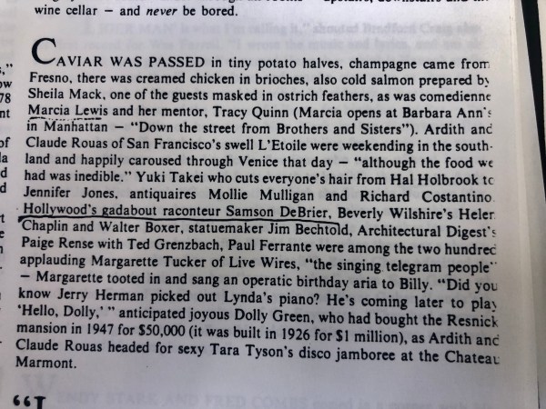 From a gossip column mentioning Samson De Brier. As a “gadabout raconteur,” DeBrier hosted a salon in the 1950s, 1960s and early 1970s. During this time until his death in 1995, he was a frequent guest at Hollywood parties, Art world parties, and parties with a mix of both. Samson was an occultist (at one time) and a friend of cult filmmaker Kenneth Anger. Kenneth Anger directed Samson in his 1953 experimental film Inauguration of the Pleasure Dome. The film is based on writings of occult figure head Aleister Crowley. I recently read the film was inspired by a Renate Druks party with a theme: Come As Your Madness.