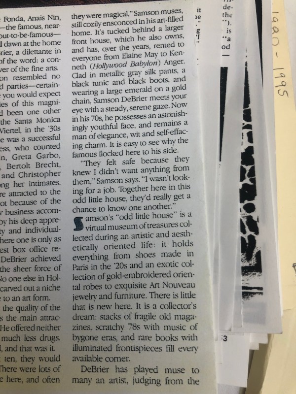 I only went into Samson’s Barton Avenue home once, and that was through an invite from one of his female friends. When I saw Samson at art openings or film events, he was usually with a pretty woman. All of his women were protective of him, and in my view, they were at odds with each other. I was sworn to secrecy not to reveal who took me to the house after Samson passed away. I think it was a day or two after he died. At the time I was the director at Beyond Baroque, the literary/arts center in Venice, California.