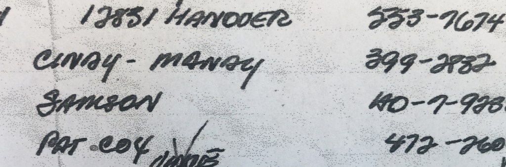 From my copy of names with phone numbers that Melanie Myers recorded from Paige Young’s phone book. The LAPD confiscated the phone book after Melanie wrote down the names and numbers.