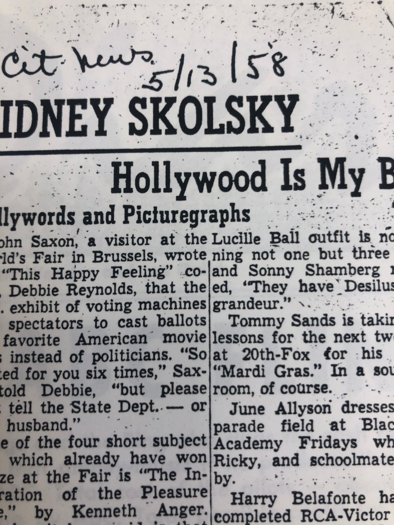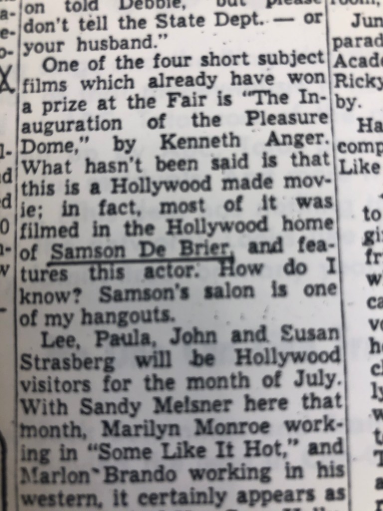 Sidney Skolsky column. A current item on Marilyn Monroe along with his mention of Samson and Kenneth Anger and the famous underground film, The Inauguration of the Pleasure Dome.
