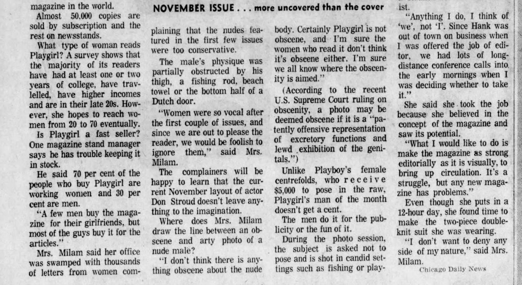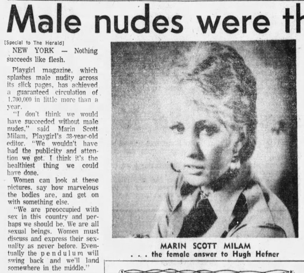 I don’t recall hearing or reading the name Marin Scott Milam– But I certainly remember media reports, sightings at newsstands and convenience stores, of the notorious magazine she launched: Playgirl
