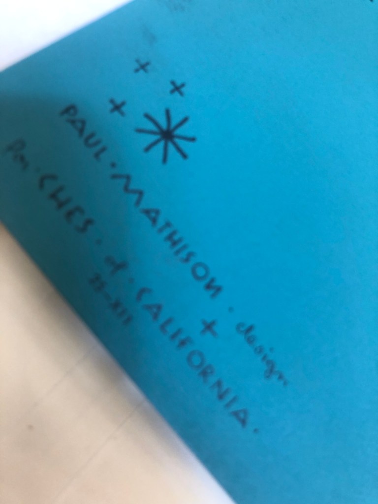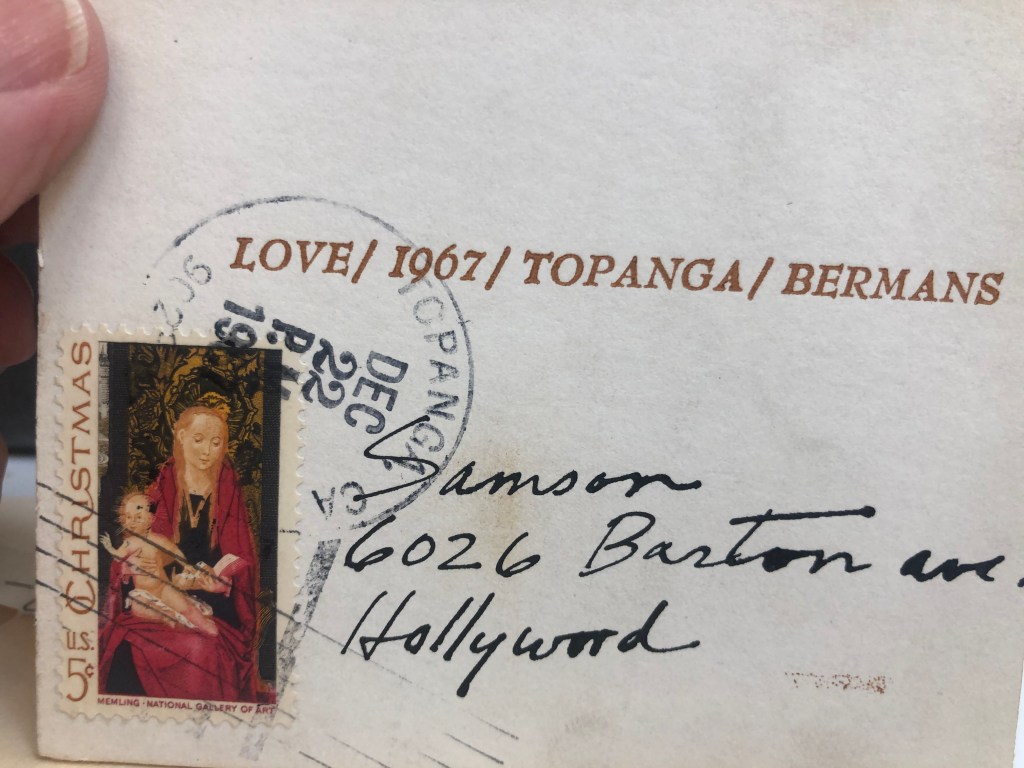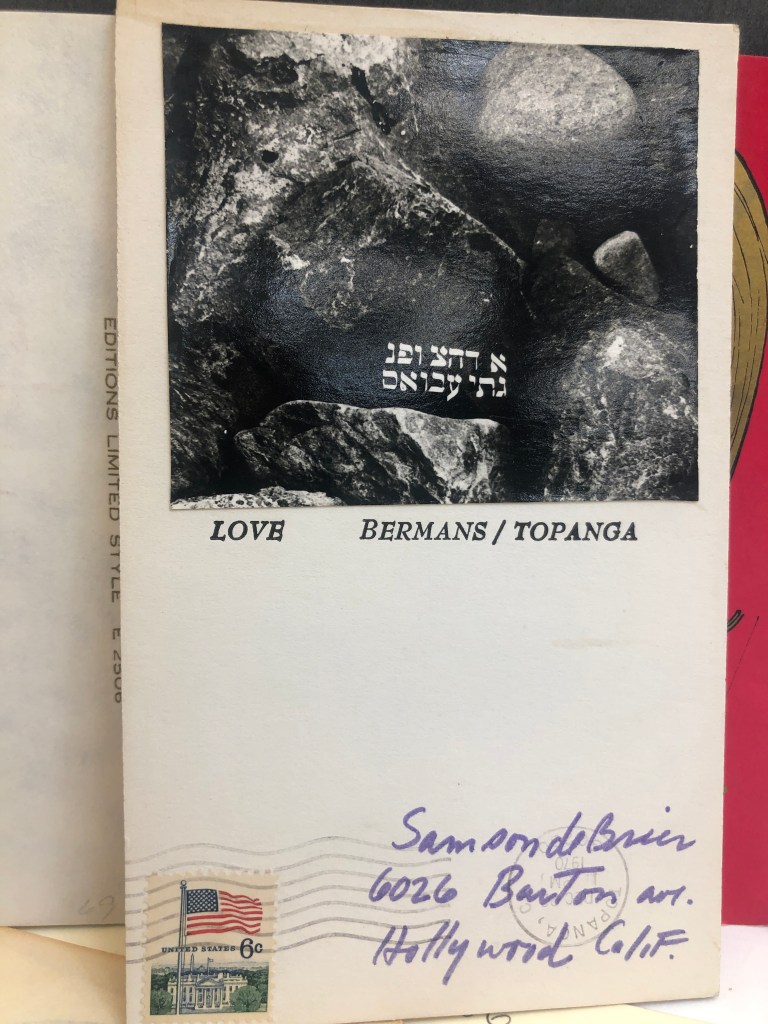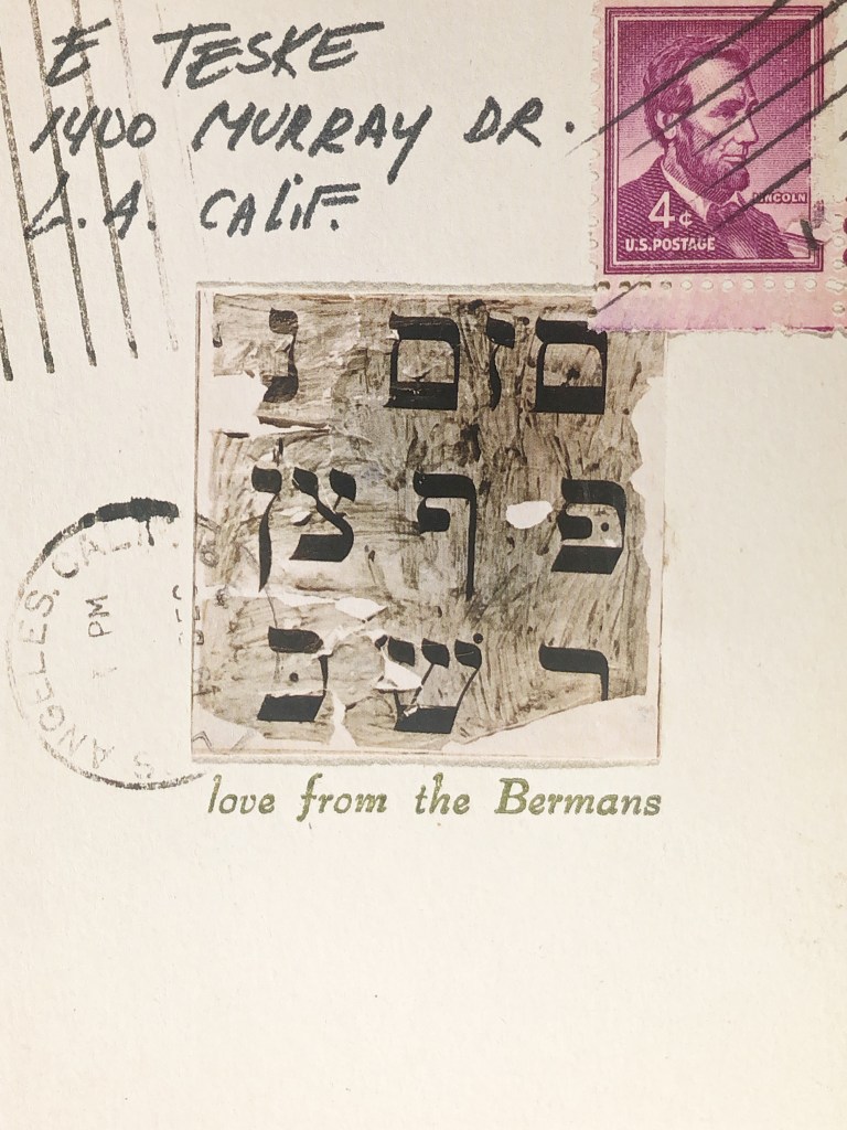 Innovative LA artist Wallace Berman made these thick cardboard Christmas “postcards.” He sent them out every year to friends/ fellow artists. This is one for Samson.