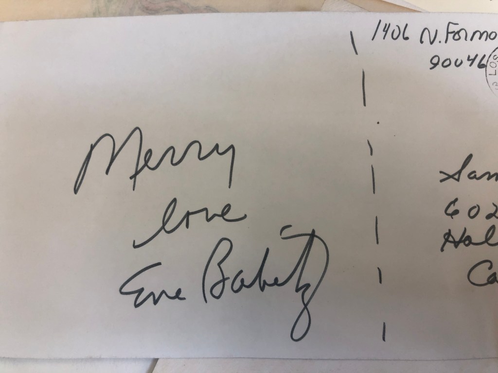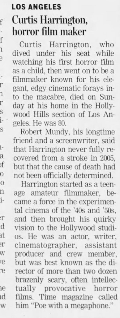 I viewed several Christmas cards to Samson from Curtis Harrington. Harrington was a director from the 1950s through the 1970s. He is most known for his cult film Night Tide, 1961, featuring a young Dennis Hopper, occultist-artist Cameron and Luana Anders. Harrington directed 1970s cult horror films: What’s the Matter with Helen?How Awful AboutAllan, 1970, The Killing Kind, 1973 with Luana Anders. Whoever slew AuntieRoo?1972 with Shelley Winters seen above. Lots of episodic TV: Charlie’s Angels,Wonder Woman, Hotel, Vega$, Dynasty, The Colbys. Harrington’s last credit was for acting in a short horror film: Usher, 2000. He died in LA in2007. From what I’ve read on the internet, Harrington never got the chance to fully realize his vision as a director. This is why Night Tide is considered his most realized work. I am interested in looking at the TV episodes he directed. There is no dedicated biography of Harrington. He wrote a memoir with a marvelous title: Nice Guys Don’t Work InHollywood. I plan to read it soon!
