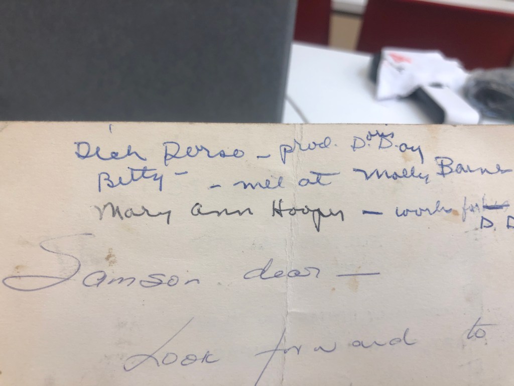 Dick Derso-Prod. Doris Day. Betty-met At Molly Barnes (Gallery) Mary Ann Hooper-works for DD. Typical of notes Samson jotted down to remember people he met.