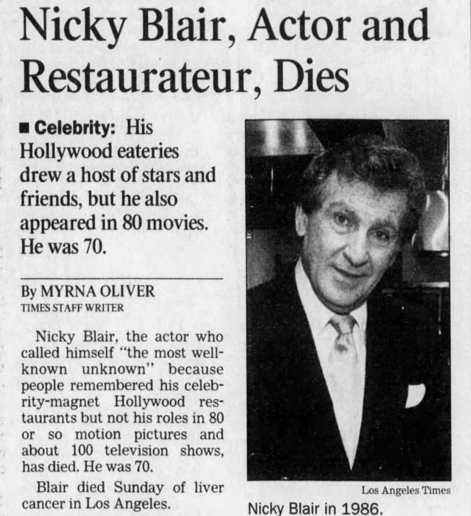 More from LAT Obit. Hollywood “tea” describing the heyday of Nicky Blair’s.